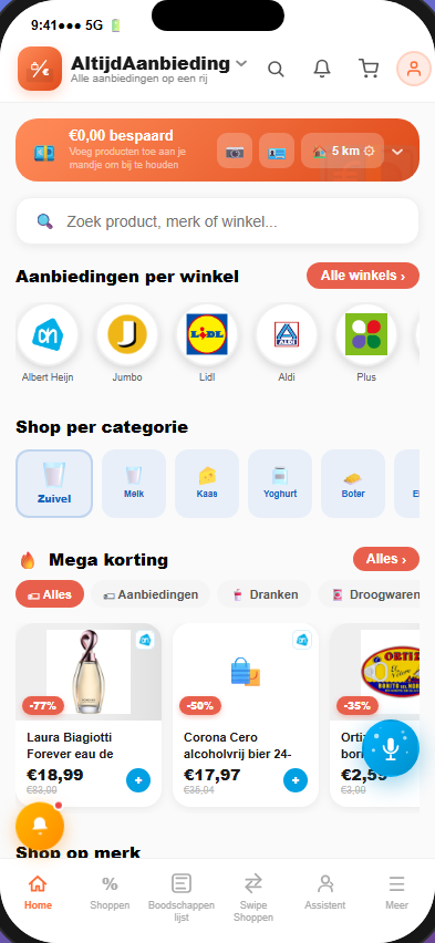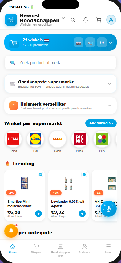 Je boodschappenlijst toont altijd de goedkoopste optie per product — over alle supermarkten heen. Kies bewust: soms 2x dezelfde AH Huismerk, soms de Jumbo-aanbieding. Gemiddeld bespaar je tot €40 per week.
